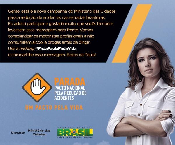 Na tarde desta quarta-feira (6), Paula Fernandes usou suas redes sociais para mostrar uma campanha de trânsito que ela está participando. A cantora aceitou o convite do Ministério das Cidades para a campanha do Pacto Nacional pela Redução de Acidentes, Parada – Um Pacto pela Vida.